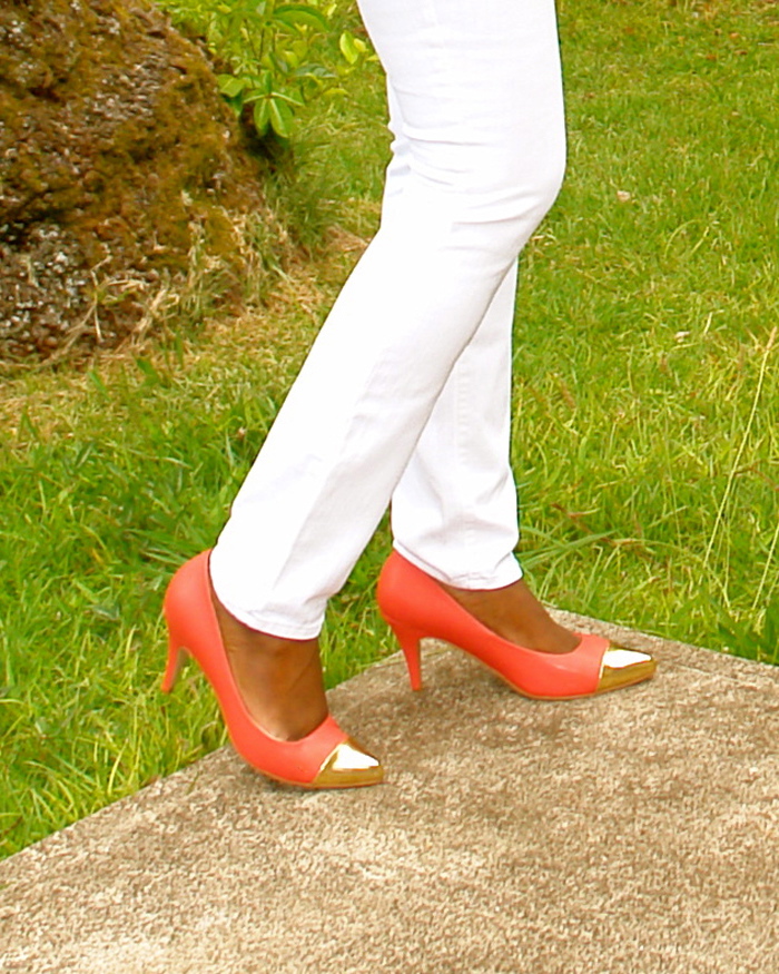 Barefoot Tess is an online shoe retailer that carries larger size women’s shoes from size 10-15.  So I was Über excited when I was given the opportunity to style and review the B.F.T  ”Charlotte” heel in coral/gold from Barefoot Tess, to style and review for you all. I love the rich coral color and the gold cap toe, gives this shoe that extra oomph.  It definitely rings true to their motto, “Because style doesn’t stop at a size 10.” These shoes are super comfortable, super cute and oh so stylish. Now note they do run a bit wide, but if your feet are a tad on the wide side like mine, then this would be a comfortable and great fitting shoe for you. I’m wearing a size 13 It states that the heel height is 3.5″ but when wearing this shoe it does not feel like that at all and it does not look like it is that high either.  It feels and looks more between 2″ and 2.5″ at the most, which I actually prefer because that makes them everyday wearable for me. So these lovelies will definitely be a part of my regular rotation this spring and summer.